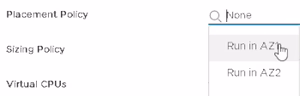 - orgVDC AZ1+AZ2 : Run in AZ1 => l'instance de calcul sera hébergée de préférence sur le site AZ1. Si on le souhaite on peut sélectionner la seconde placement policy Run in AZ2.