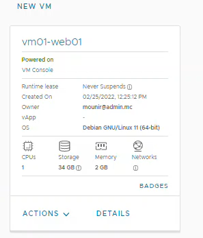 12B. L'instance de calcul est désormais déployée sans OS. Sur la carte de la vApp contenant la l'instance, cliquez sur Actions, puis sélectionnez Power On. La vApp ansi que les instances vont démarrer.
