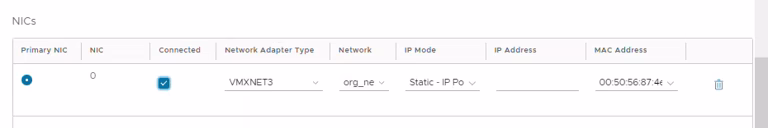 Attention par défaut nos templates ne possèdent qu'une interface mais il est possible d'en rajouter ensuite une fois la VM créée. Il faut sélectionner ici le Network à utiliser ainsi que le mode IP : DHCP, Static IP Pool ou Static manual en fonction de la configuration réseau attendue. À noter qu'il est possible de configurer les éléments suivants :