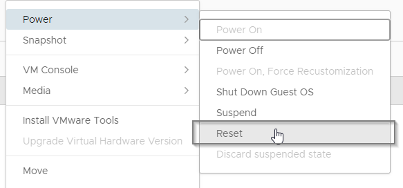 18B. Cliquez ensuite sur Power > Reset pour relancer l'instance et permettre le boot sur l'iso inséré.