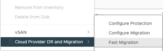 depuis le pluging VCDA, ou bien faites clic droit directement depuis une VM et sélectionnez "Cloud Provider DR and Migration - Fast Migration".