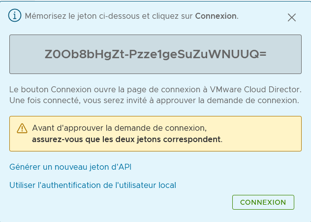 3. Un jeton apparaît en pop-up, qui sera à comparer avec le pop-up de jeton qui s'affichera une fois connecté sur le tenant Monaco Cloud pour le valider. Cliquez sur "Connexion".
