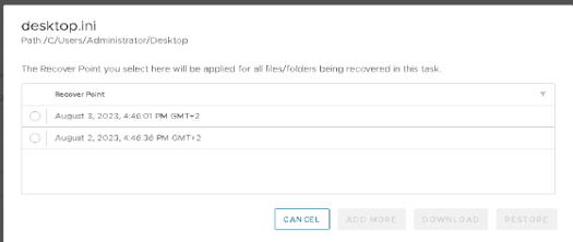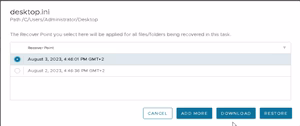 Si l’on choisit ADD more, dans ce cas nous revenons au point précèdent sur la sélection de fichier et on peut ainsi ajouter d’autre fichiers qui seront restaurés par la même tâche donc avec les mêmes paramètres. Le cas DOWNLOAD sera traité après le mode RESTORE.