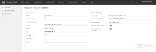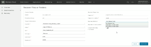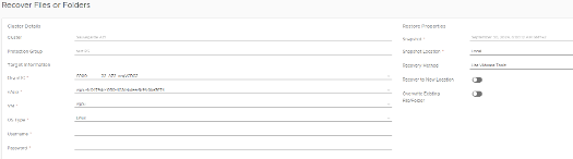 Dans les méthodes de récupération on a un menu déroulant avec plusieurs choix possibles, dans notre cas seule la méthode Use Vmware Tools est utilisable. Cela nécessite que les VMware Tools soient installés sur la VM dans laquelle vous souhaitez restaurer l’objet de type fichier ou dossier. Celle-ci nécessite la saisie d'un couple "utilisateur/mot de passe", cet utilisateur doit disposer des droits d’écriture dans le dossier de restauration.