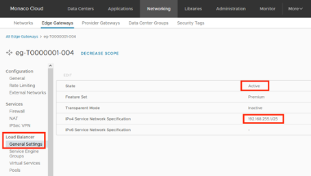 Dans le menu Load Balancer, en cliquant sur General Settings vous pourrez voir si le service est bien activé et quel est le réseau choisi pour interconnecter :