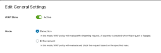Le bouton Edit de la section General permet d’activer ou non la fonctionnalité WAF sur le VS ainsi que son comportement par défaut : bloquant ou non.