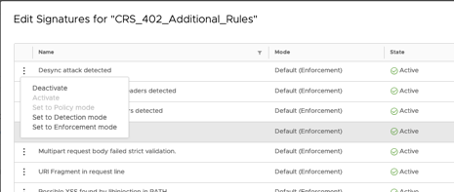 En mode détection (Detection), lorsqu’une requête est considérée comme malveillante, il y aura un log de généré. En mode bloquant (Enforcement) lorsqu’une requête est considérée comme malveillante, un log sera généré et la requête sera bloquée.
